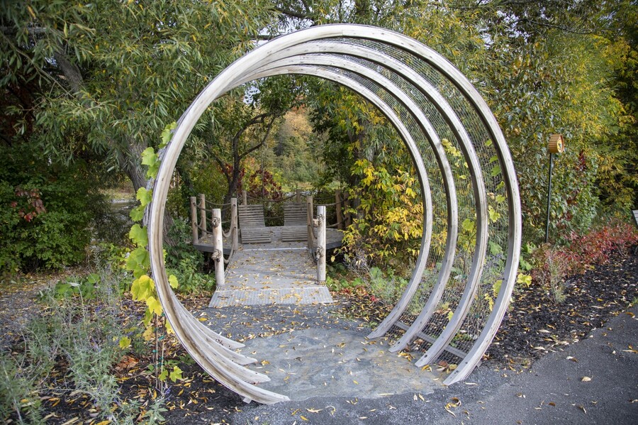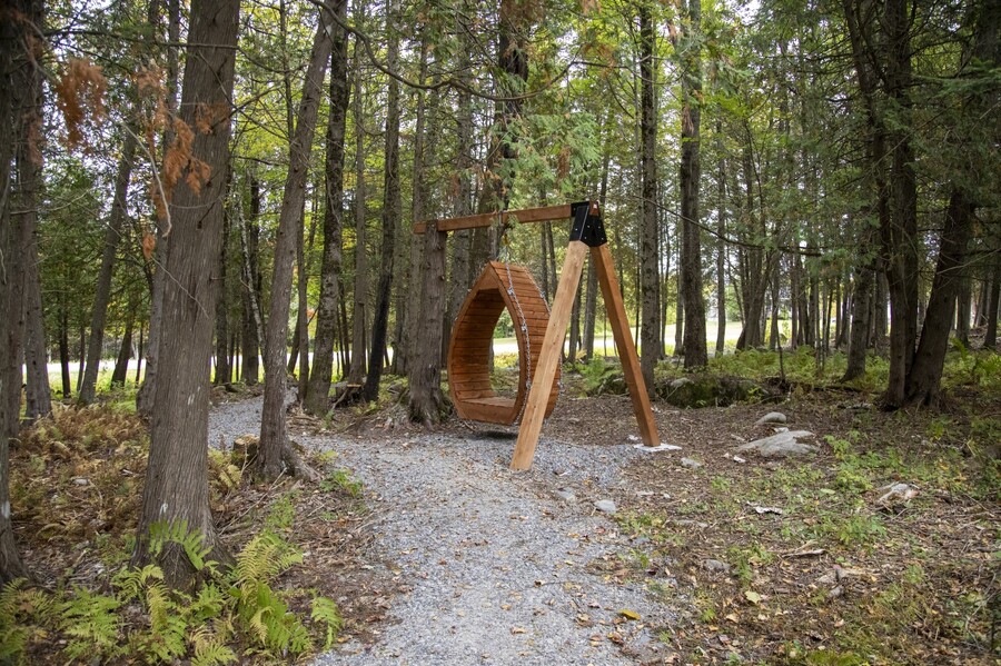 Ce bain nature s’ouvre sur un portail en bois en forme de spirale qui fait office d’œuvre à l’entrée symbolique du sentier, illustrant le lien entre l’art et la nature. Sa forme peut aussi évoquer le courant et les cascades qu'offre le plan d'eau vedette, la rivière Chaudière. Des installations telles que bancs, chaises longues, table à pique-nique, plantations riveraines, et cabanes d’oiseaux complètent l’aménagement, favorisant la biodiversité et l’immersion sensorielle.
