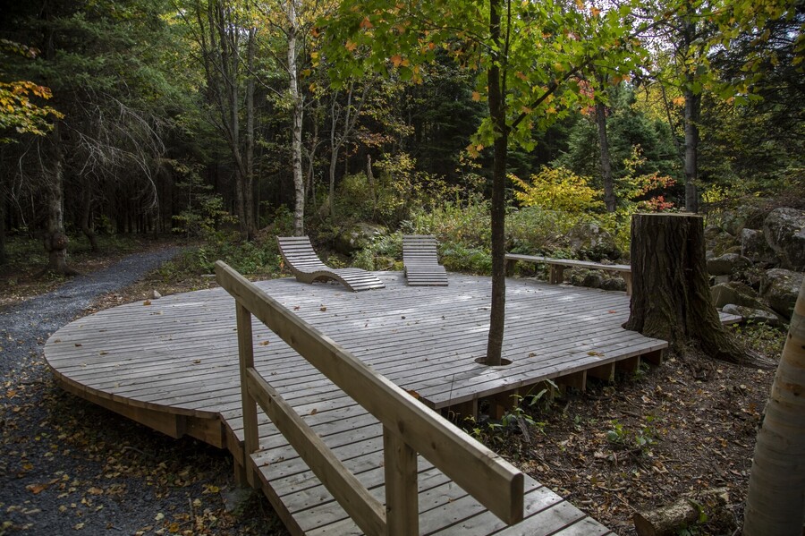Le projet de Bain de nature de la municipalité de Saint-Ludger s'inscrit dans la continuité des attraits du grand parc de l’OTJ et offre une expérience de ressourcement et de détente appréciée de la population. Cet espace met en valeur une percée visuelle sur la rivière Chaudière, permet d'apprécier les sons marins et la faune tout autour, ainsi qu'une belle lumière naturelle que module le couvert végétal naturel et odorant.