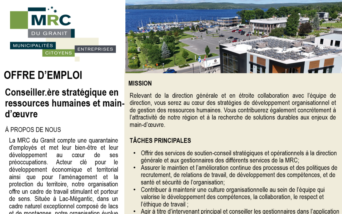 Jeudi 26 février 2026 Relevant de la direction générale et en étroite collaboration avec l'équipe de direction, vous serez au coeur des stratégies de développement organisationnel et de gestion des ressources humaines. Vous contribuerez également concrètement à l'attractivité de notre région et à la recherche de solutions durables aux enjeux de main-d'oeuvre.